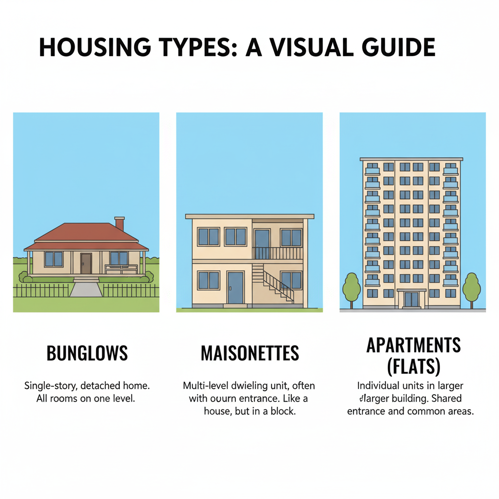 - Bungalows are single-storey standalone houses. They usually sit on their own plots and offer privacy, garden space, and easy access for families or the elderly.